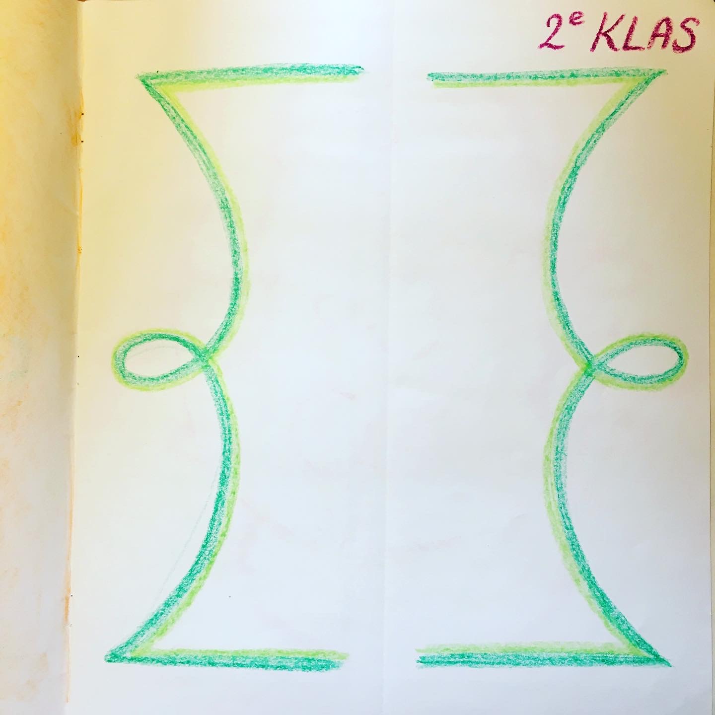 De eerste spiegelvormtekenlessen in de tweede klas zijn nog eenvoudig, maar worden met scherpe en rechte bochten en krullen steeds ingewikkelder. Door het spiegelen wordt de ontwikkeling van de linker- en rechterhersenhelft ondersteund en gestimuleerd. De middenlijn is de ruggengraat en de tweede klasse zoekt het evenwicht tussen links en rechts.